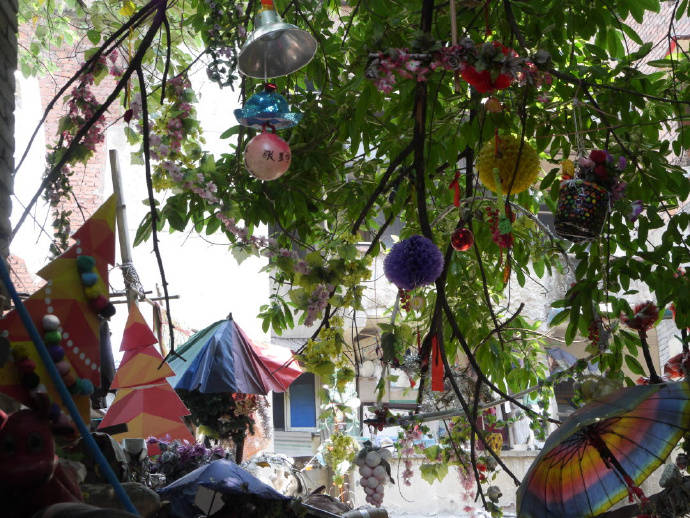 那些胡阿姨从自己身上撇开的财富与关怀,被全然赋予了她身外的物与人。胡阿姨总能发现被遗弃的宝藏,比如那个恐龙蛋、巨型蘑菇,还有各种被别人丢掉的玩偶、灯具、盆栽。在十八梯,她用别人不要的东西搭建出一片自己的花园,花园里有一座废品堆成的“雪莲山”,一个半身模特模型端坐在蘑菇下,那是她的“平安卫士”。在树梢,她挂上一串宇宙灯、假葡萄,祝不存在的孙子星宇成为一名有出息的宇航员,祝眼睛残疾的儿子少斌依然能够“硕果累累”。所有的物件上面,是一把永远撑开的彩虹伞。