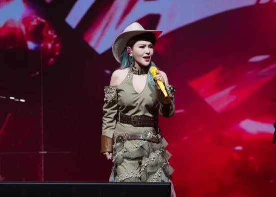首套红黑格露肩造型潮流吸睛,不规则裙摆与层次设计将时尚元素玩出个性,搭配她动感的舞台表现,一开嗓便点燃全场氛围;军绿色牛仔风“战袍”则完美展现出她的洒脱与帅性,不对称长裙搭配随性流苏和“牛仔礼帽”,充满独特艺术设计感,将潮流与艺术大胆融合,个性且张力十足,更与《天边的天籁》等演唱曲目精准契合,实现服装、歌曲与场景的完美整合;第三套复古棕色套装点缀复古纹样,细节满满,手工质感与复古色调尽显艺术底蕴,在演绎经典曲目时,瞬间拉满氛围感。
