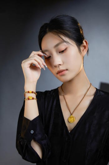 万春纳福系列“星檐”足金饰品套装:包含项链、耳饰、手链三件套,设计灵感来自万春亭的“三重檐四角攒尖顶”。以俯瞰视角提炼建筑的对称美学,将檐角的弧度转化为首饰的线条,套装整体简约大气,既能日常佩戴,又暗藏对古都建筑文化的致敬。