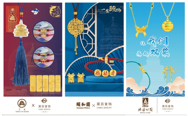 菜百股份与景山公园、北海公园两大文化单位联名的“万春纳福”“海誓金盟”系列多款足金作品,成功入选“古都印记”赛道。