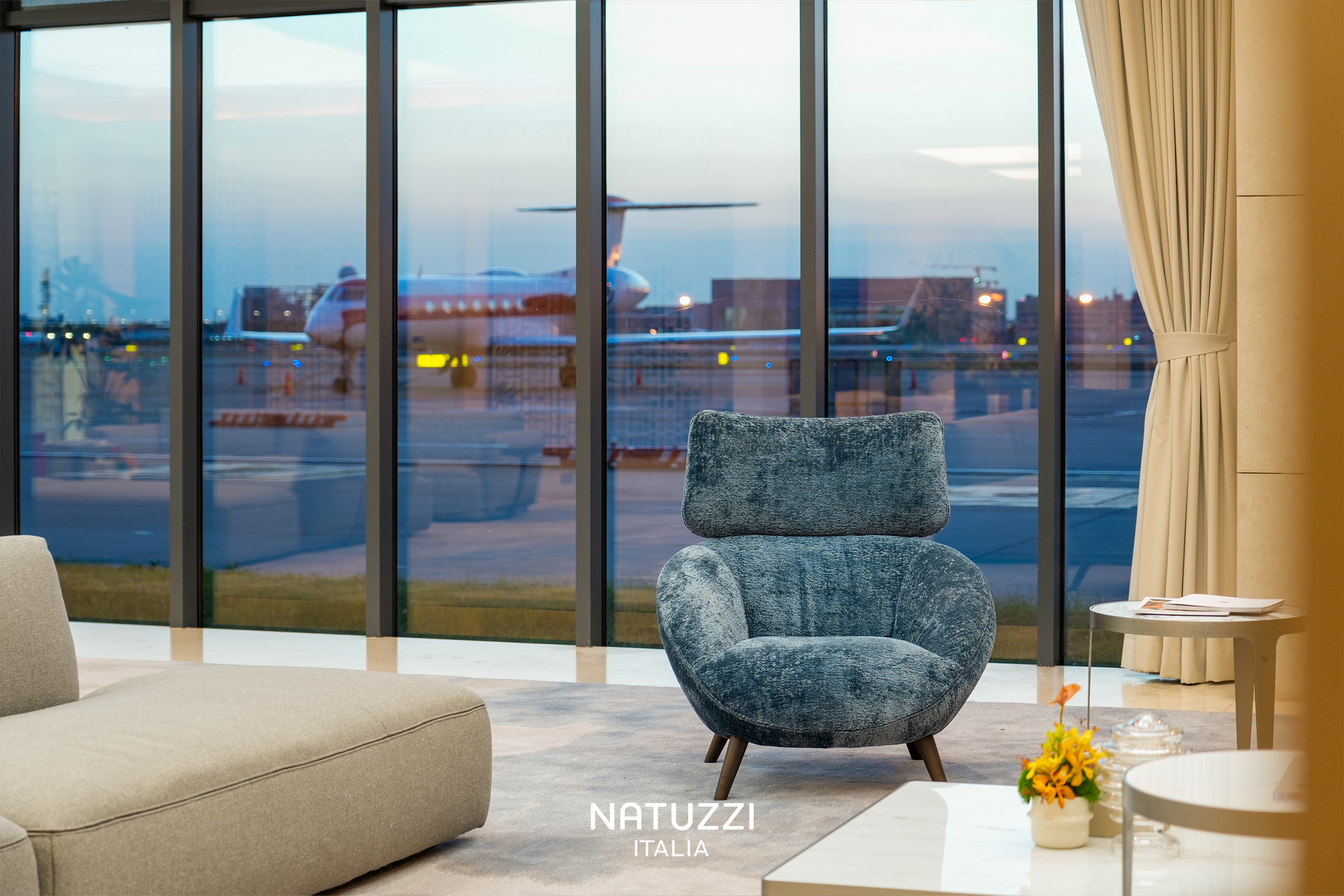 与中央大厅通过一道镂空原木屏风巧妙相隔,商务侧厅在延续整体空间开放通透框架的同时,也界定出相对独立的社交场域。这里不仅有着巨型波浪纹饰灰蓝绒毯与窗外停机坪视野相映成景,更采用了极具前瞻性的“岛屿化”布局。Natuzzi Italia 通过模块化的沙发与圆融的扶手椅进行自由组合,在空间内形成了多个互有中心又彼此关联的舒适单元,既保障了私密性,又激发了随机交流的多种可能。Herman沙发以其匀润轮廓与亚麻织物覆面模块形成刚柔对比,Luna 扶手椅与Herman茶几则进一步平衡了空间的质感与轻盈。使之成为一个集商务洽谈、短暂休憩与灵感碰撞于一体的现代社交场域。