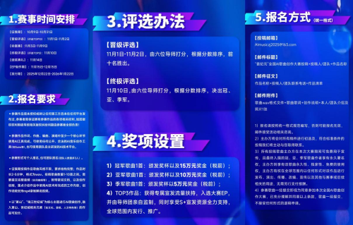 大赛设置了丰厚的奖金,总奖金高达30万元,最终Top3的冠、亚、季军作品将入选大赛EP,并由导师团亲自监制,同时享受S + 宣发资源全力支持,实现全球230+国家和地区同步发行,助力AI原创音乐走向世界舞台。特别值得一提的是,歌曲征集期将于10月31日截止,各位参赛者和团队可在有效时间内投稿,据悉以“萧山”“钱江世纪城”为主题并融入相关文化、人文或景观元素的作品,将获得额外加分。