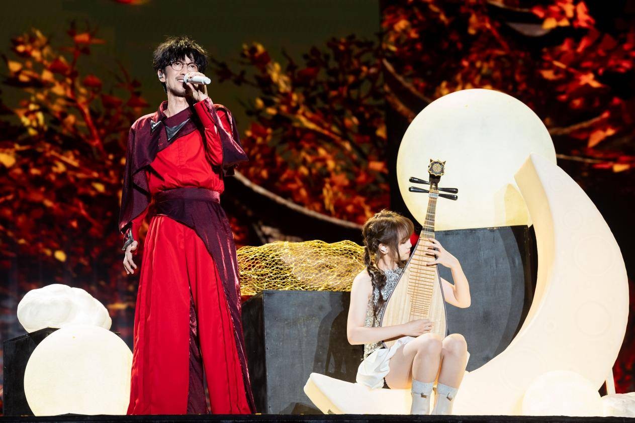 黛芬妮怀抱一把琵琶用心弹奏,动听旋律潺潺流淌;小刚老师则是一身红装,陪在女儿身旁深情演唱,眼中满是“吾家有女初长成”的欣慰疼爱。巡演团队还为这次父女同台专门制作了月亮造型的舞台布景,让现场看起来格外温馨。