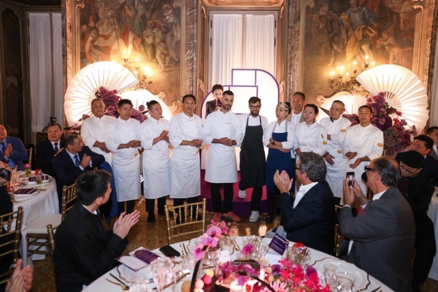 随后,杨澜向现场宾客介绍了厨师团队:本次晚宴由中国烹饪大师、中国烹饪协会名厨专业委员会常务副主席、中华传统技艺技能传承人王海东,“意大利厨房”(La Cucina Italiana)行政总厨克雷申佐·莫兰多(Crescenzo Morlando),“意大利30岁以下最佳新锐主厨”达里奥·皮萨尼(Dario Pisani),北京MADverse摩境数字艺术空间主厨冯嘉星及中国女厨师冯宇领衔,巧妙融合了中式烹饪哲学与意大利食材特色,呈现一系列兼具东方韵味与地中海风情的创意菜肴,让现场宾客在味蕾上感受中意文化的碰撞。