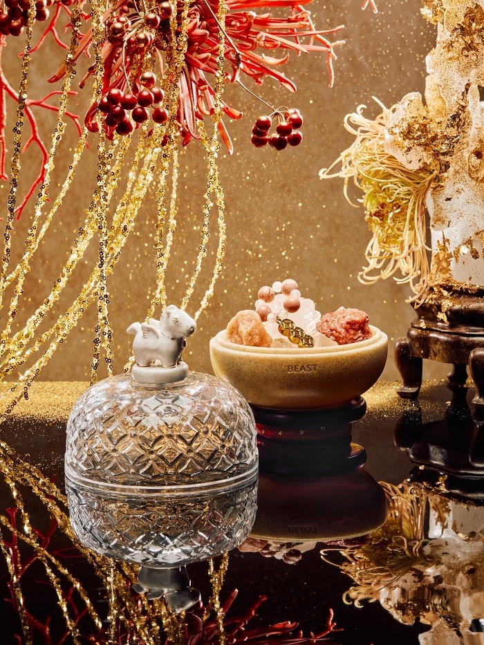 而在更具陈设与收藏意味的年礼选择上,“飞马运宝”晶石香氛罐同样延续「醉马观花」香意,以描金小飞马造型为核心,昂首立于铜钱纹玻璃罩之上,寓意纳财聚福、行运在握。该系列以“晶石藏香”为旨,带来两款不同呈现:其一于罐中点缀晶石珠链,飞马身姿更显灵动;其二以金箔工艺铺陈玻璃罩,金意更盛、光泽更足,为年礼添一份沉稳华彩;该款小飞马亦可作线香香座,让焚香与散香同器相映。两款皆以“运宝入门、福泽绵延”的视觉意象,回应新岁对丰盛与安稳的期盼。