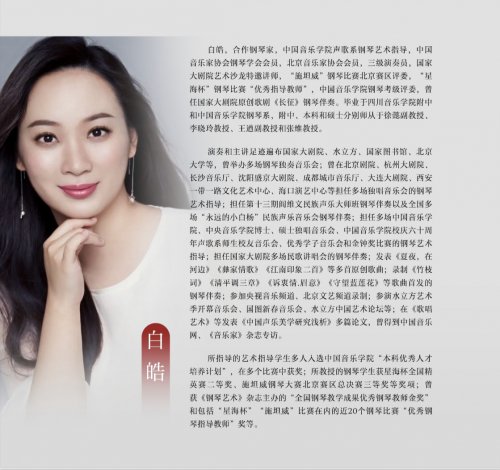 作为中国音乐学院声歌系钢琴艺术指导、国家大剧院艺术沙龙特邀讲师、“施坦威”钢琴大赛评委,白皓老师此次推出的《指尖的旋律——白皓原创歌曲及合作钢琴歌曲专辑》,收录了《西湖美》《钗头凤·红酥手》《夏夜,在河边》《竹枝词》等16首作品,这张专辑汇聚了白皓音乐创作的精华,体裁涵盖古诗词歌曲、原创艺术歌曲、民歌创新改编等多元音乐体裁。