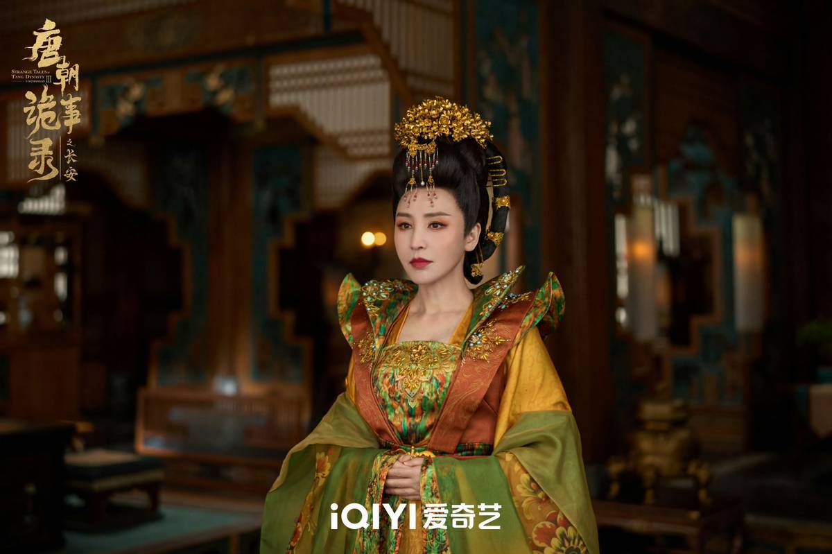 剧中,岳丽娜再度饰演“长公主”一角,并以其经典的宫廷造型惊艳亮相。她头戴凤冠,身披华美唐装,将古典威仪与华贵气质完美融合。在光影构图的衬托下,她宛若从古画中走出的唐代贵人,眉宇间尽显皇家气度与睿智风采,生动串联起诡谲案情与大唐美学的叙事氛围。