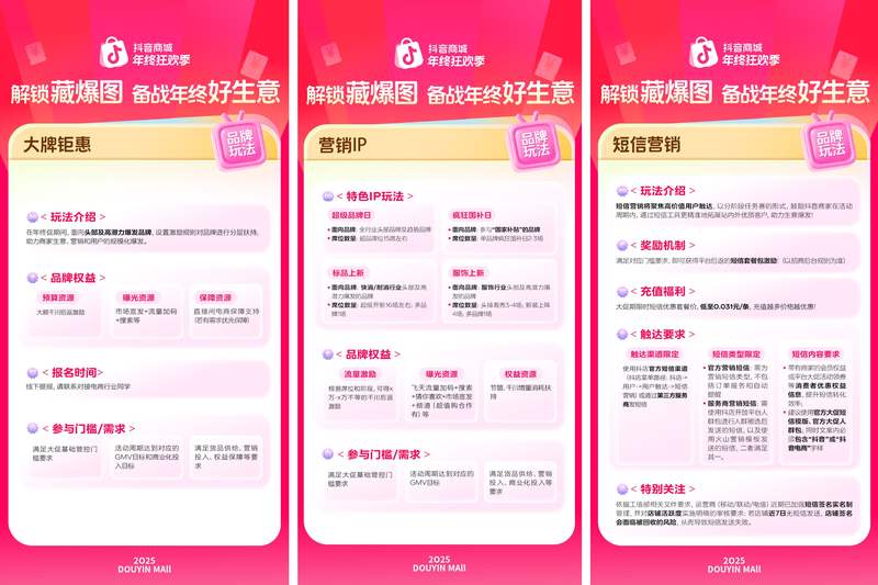 年终消费旺季将至,「2025抖音商城年终狂欢季」也将在12月3日正式启动。这不仅是商家冲击年度目标的关键节点,也是布局新增长的黄金窗口。为助力商家把握增长机遇,活动发布年终大促“藏爆图”,从价格力、内容力、爆发力、营销力等多个维度,为商家备战「2025抖音商城年终狂欢季」提供清晰指引,助力商家在激烈竞争中赢得确定性增长。