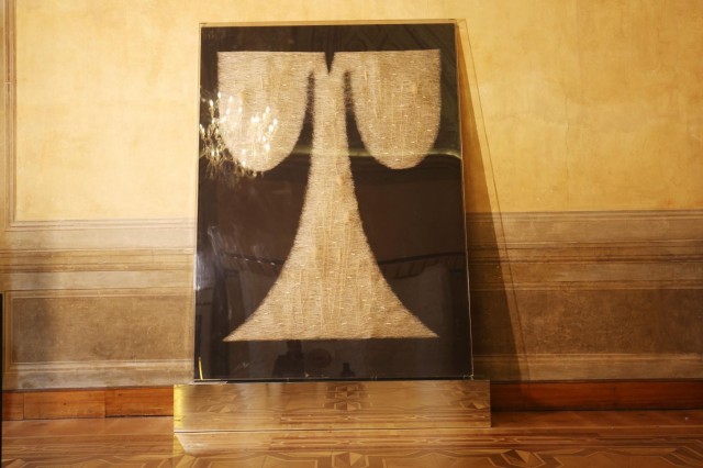 陈庆庆的《拷贝出土文物-汉 3》将马王堆汉帛的沧桑、女性坚韧精神及传统麻衣礼仪,交织成历史物语。其装置以麻的柔韧为媒介,将自然材料蜕变为精神载体——汉帛造型嵌干花、层叠麻衣裹红核的意象,传递古今人文对话。
