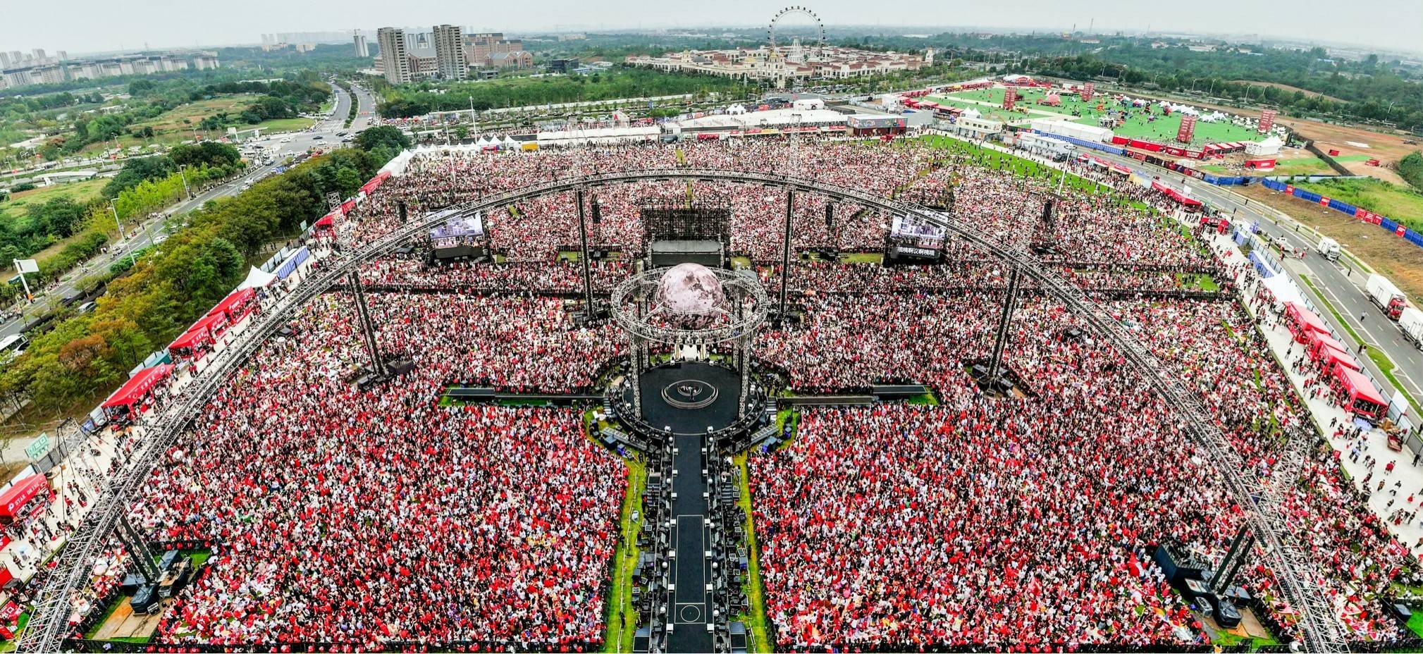 本次南京站首次将演唱会场地升级为全自主打造的乐园生态系统,让演唱会超越了“场”的概念,升维为一个持续八日(10月1-8日)开放的音乐小镇。团队从荒芜平地起步,历时数月完成基建、绿化、舞台搭建及互动区规划,最终呈现出一座集舞台艺术、自然景观与科技娱乐互动于一体的“火星乌托邦”。现场不仅延续了乐园模式的经典设定——全员站票、双场联演、艺术展览与美食市集,更将“火星乌托邦”的核心理念——爱与分享,融入至整体氛围中,真正构建了一个真实存续的情感共同体,也形成了、连接彼此的温暖纽带。